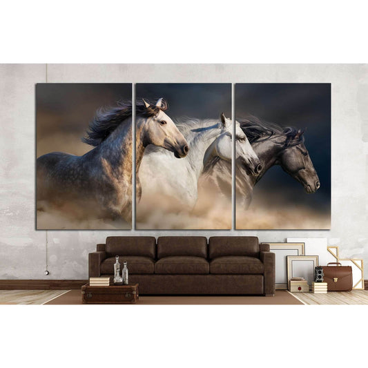 Horses with long mane portrait run gallop in desert dust №1326 Ready to Hang Canvas Print