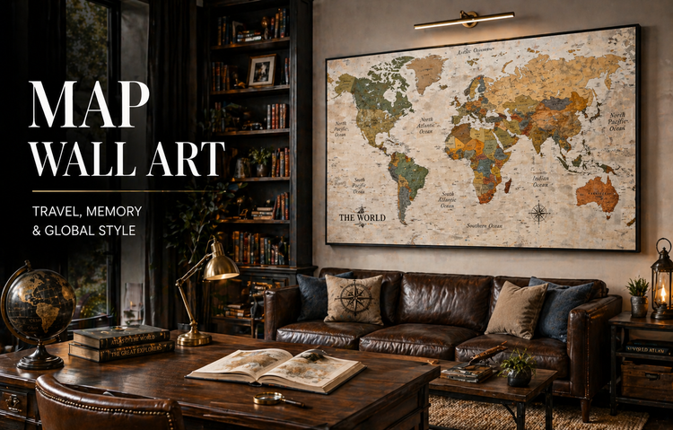 Map wall art brings geography, memory, and a sense of discovery into the room. From classic world maps to colorful travel maps and vintage cartographic prints, these artworks work beautifully in spaces shaped by travel, study, planning, or global perspective.