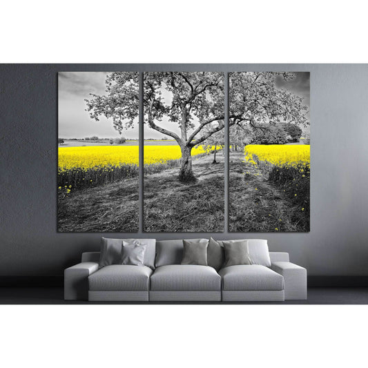 Shining yellow oilseed rape fields in a black and white landscape №2684 Ready to Hang Canvas Print