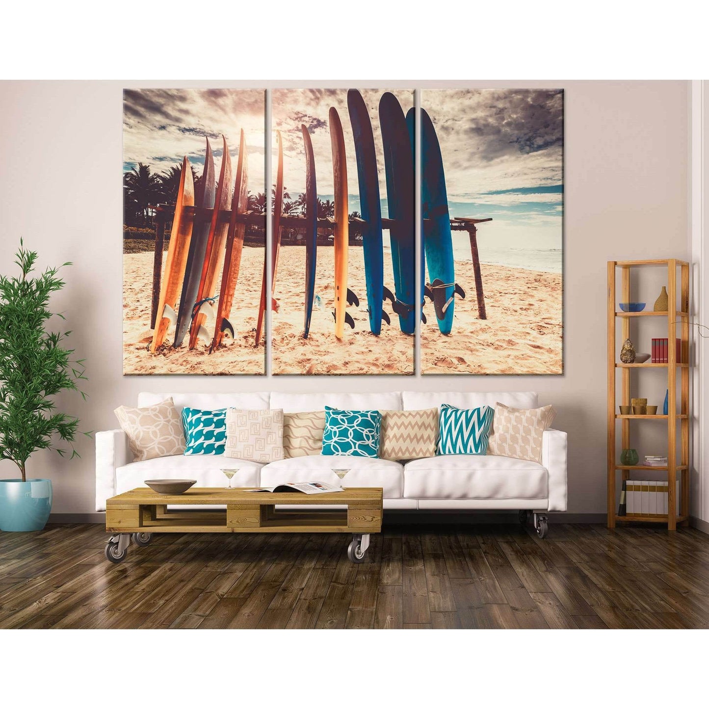 Surfboards Wall Decor canvas art arrives ready to hang, with hanging accessories included and no additional framing required. Every canvas print is hand-crafted, made on-demand at Zellart and expertly stretched around 100% North American Pine wood stretcher bars. We only use industry leading archival UltraChrome® Giclée inks to achieve the most vivid and high-definition prints possible.